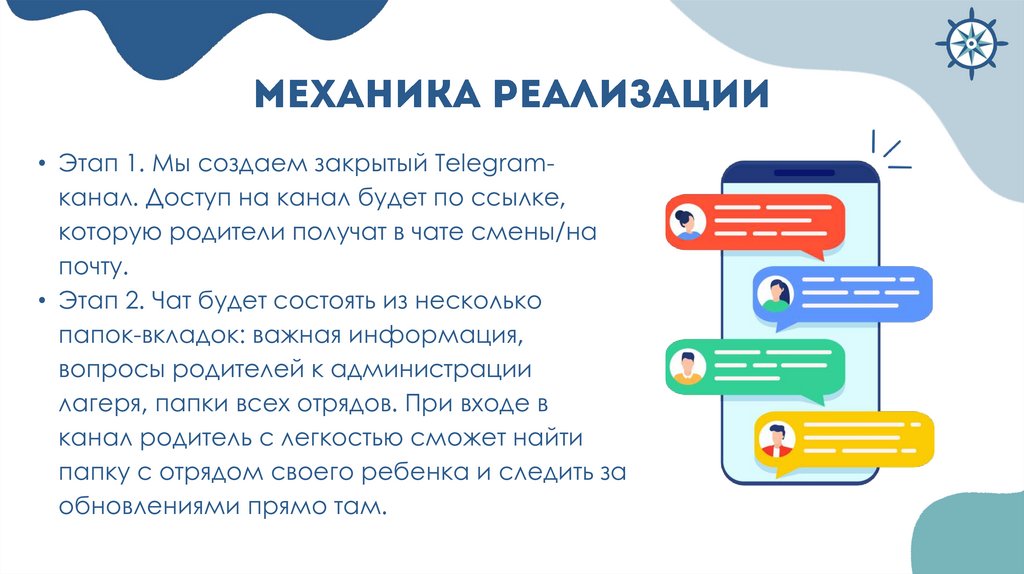 • Этап 1. Мы создаем закрытый Telegramканал. Доступ на канал будет по ссылке,которую родители получат в чате смены/на