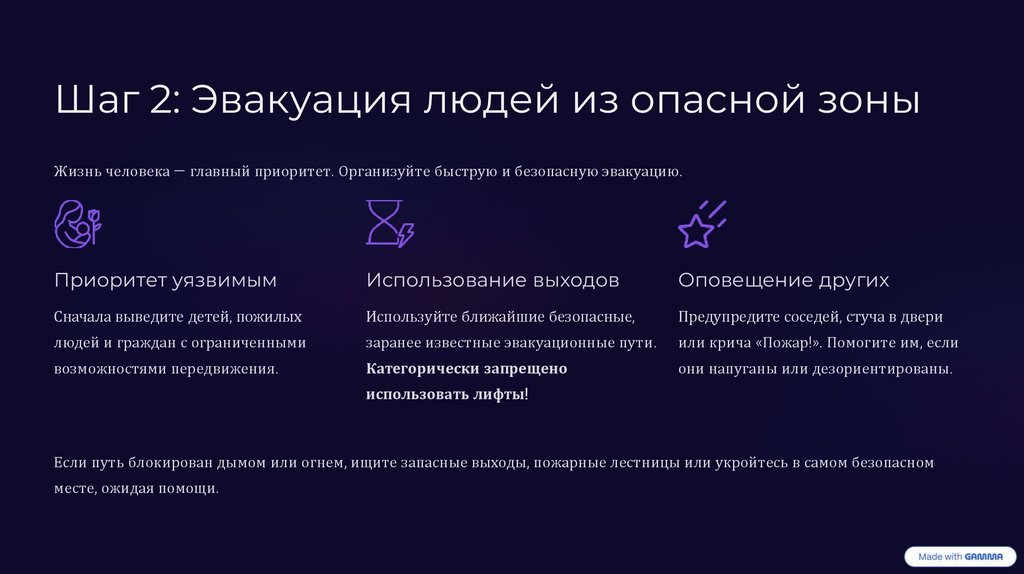 Шаг 2: Эвакуация людей из опасной зоныЖизнь человека — главный приоритет. Организуйте быструю и безопасную эвакуацию.