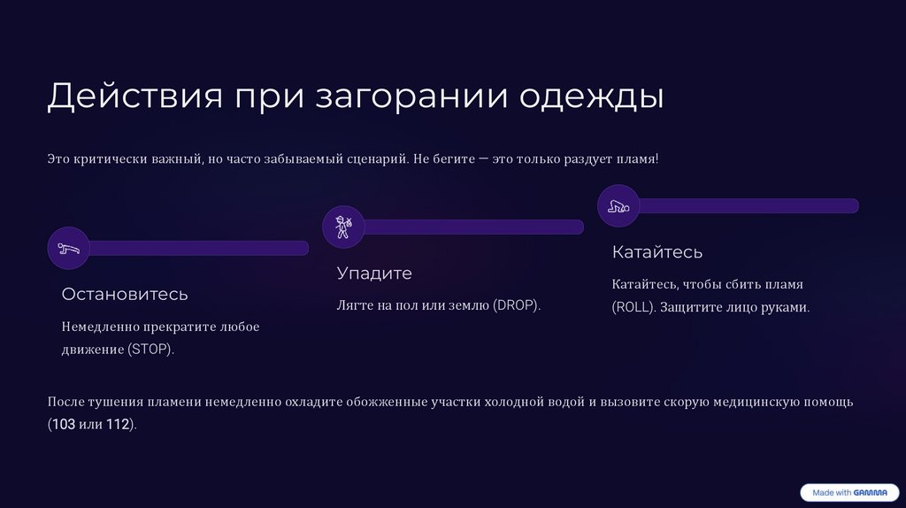 Действия при загорании одеждыЭто критически важный, но часто забываемый сценарий. Не бегите — это только раздует пламя!