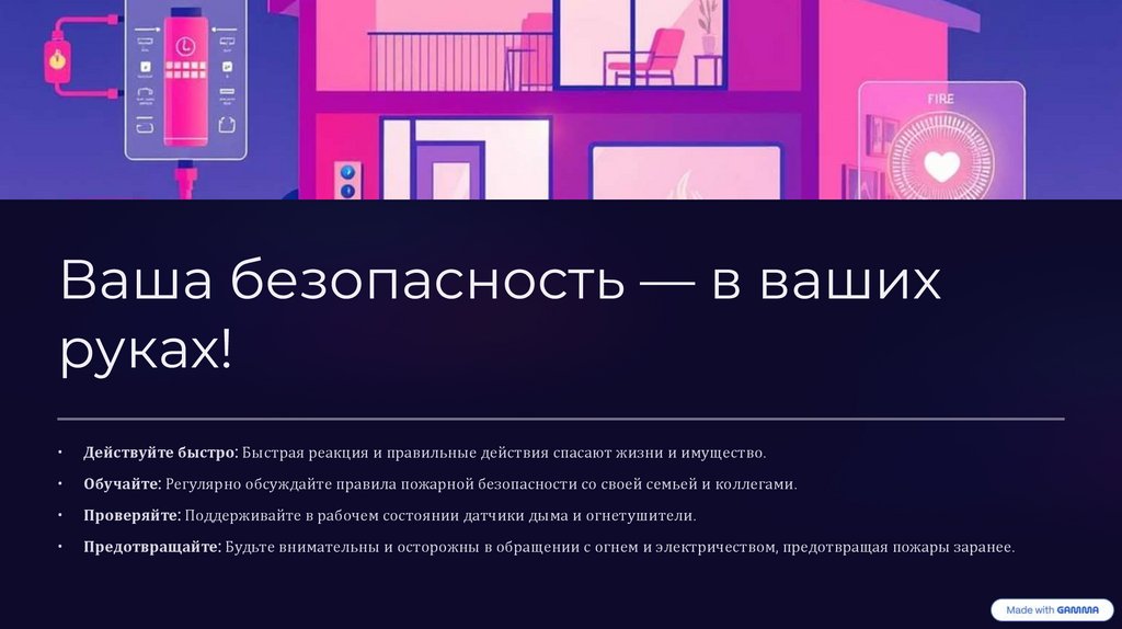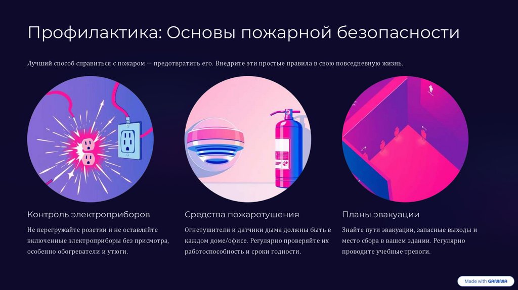 Предотвращайте: Будьте внимательны и осторожны в обращении с огнем и электричеством, предотвращая пожары заранее.