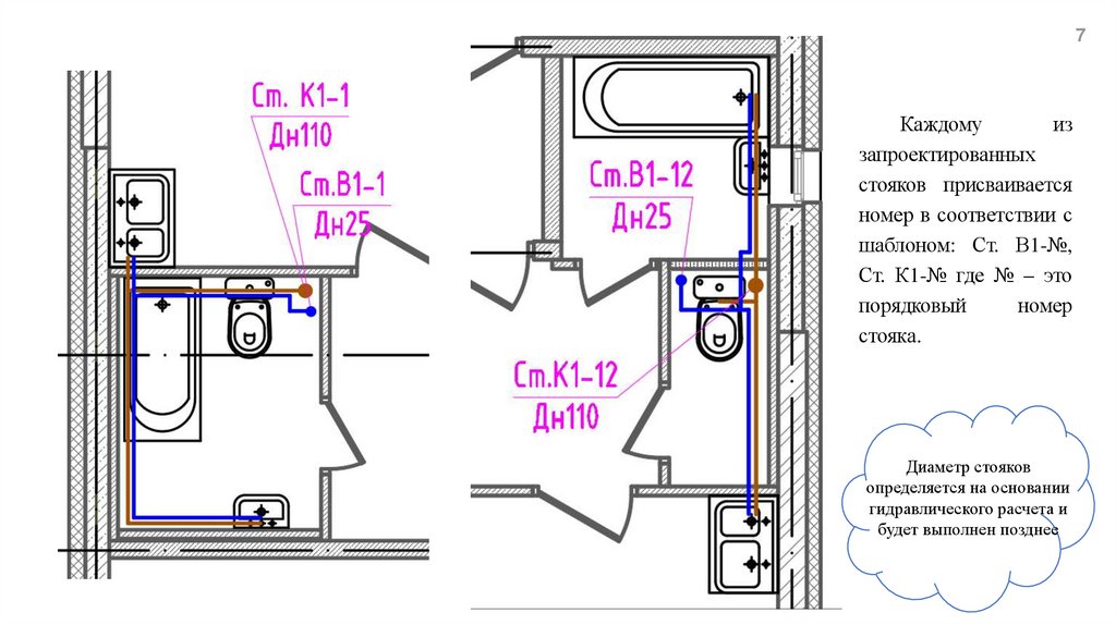 Расстановка водопроводных и канализационных стояковна планах типового этажа