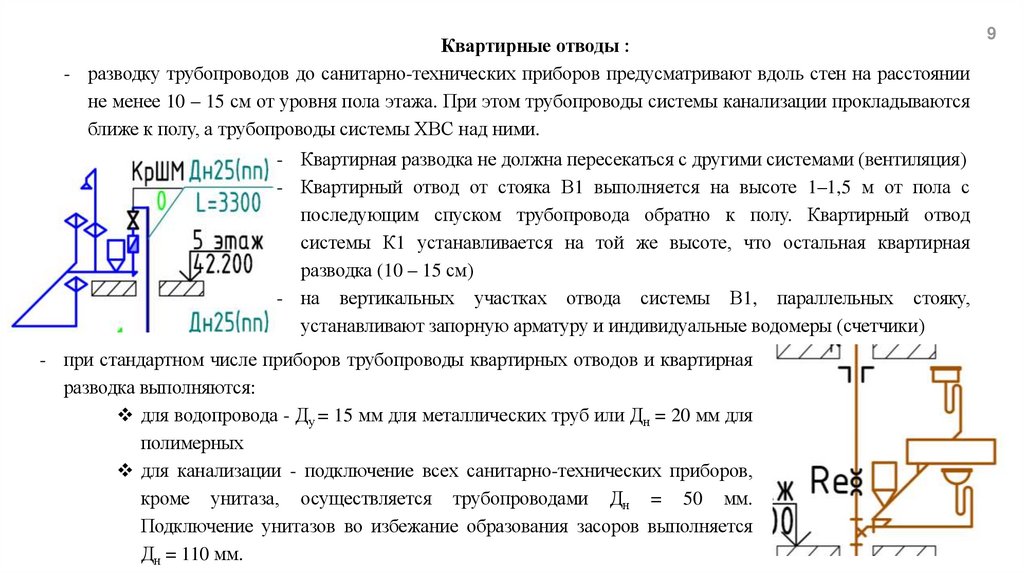 Квартирные отводы :- разводку трубопроводов до санитарно-технических приборов предусматривают вдоль стен на расстоянии