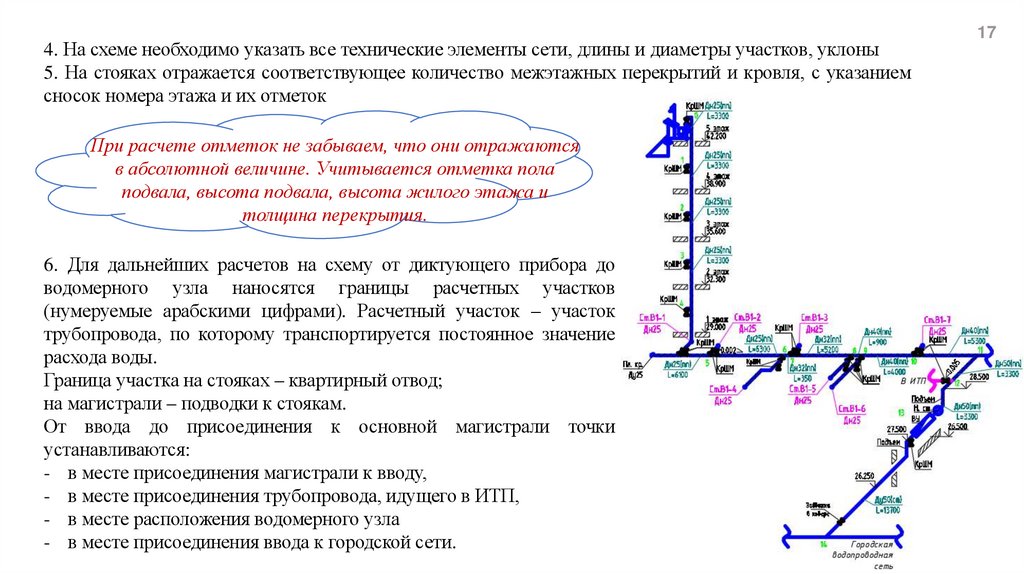 4. На схеме необходимо указать все технические элементы сети, длины и диаметры участков, уклоны5. На стояках отражается соответствующее количество межэтажных перекрытий и кровля, с указанием