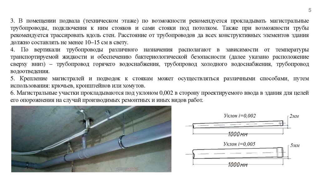 5. Крепление магистралей и подводок к стоякам может осуществляться различными способами, путем