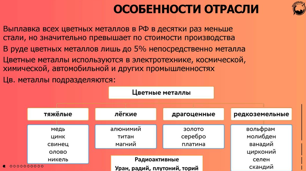 ОСОБЕННОСТИ ОТРАСЛИВыплавка всех цветных металлов в РФ в десятки раз меньше