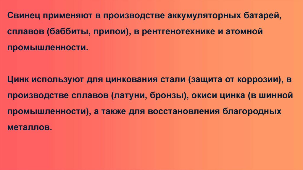 Свинец применяют в производстве аккумуляторных батарей,сплавов (баббиты, припои), в рентгенотехнике и атомной