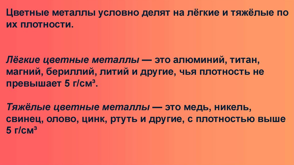 Цветные металлы условно делят на лёгкие и тяжёлые поих плотности.
