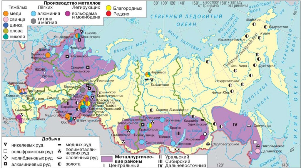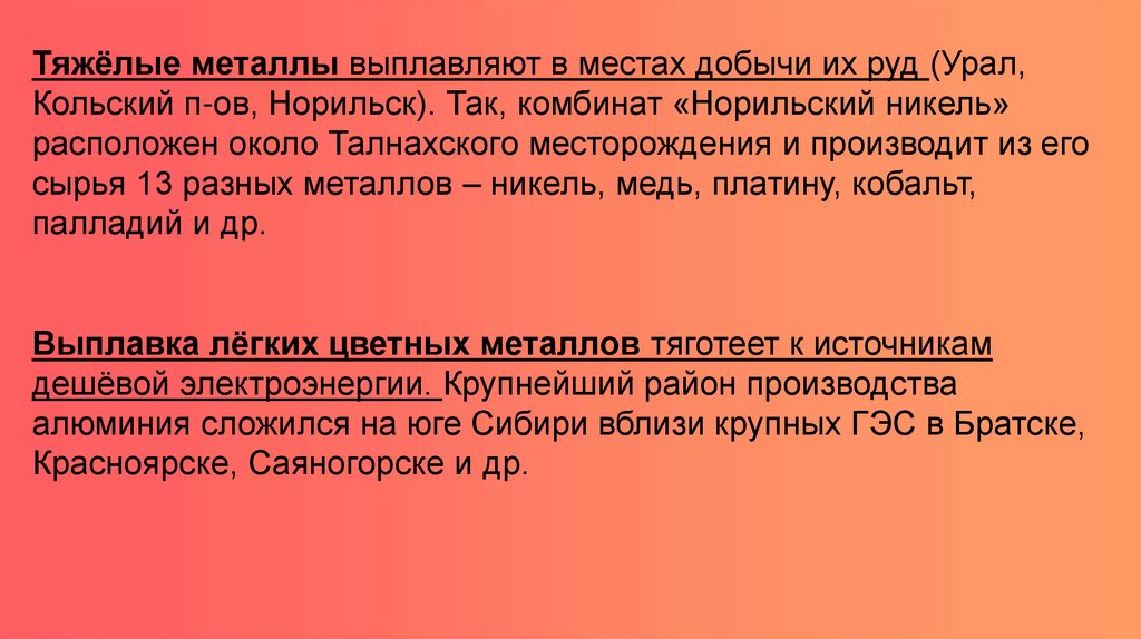 Тяжёлые металлы выплавляют в местах добычи их руд (Урал,Кольский п-ов, Норильск). Так, комбинат «Норильский никель»