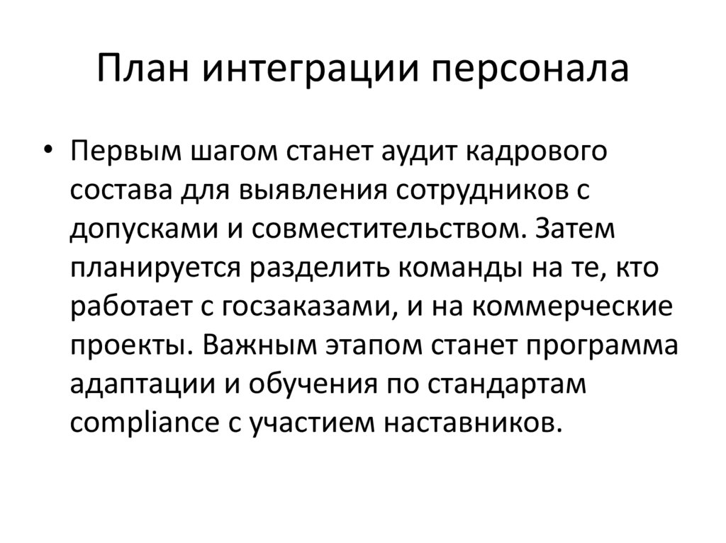 План интеграции персонала• Первым шагом станет аудит кадрового