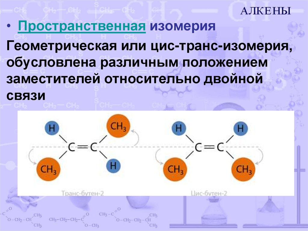 • Пространственная изомерияГеометрическая или цис-транс-изомерия,