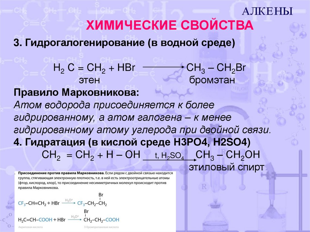ХИМИЧЕСКИЕ СВОЙСТВА3. Гидрогалогенирование (в водной среде)