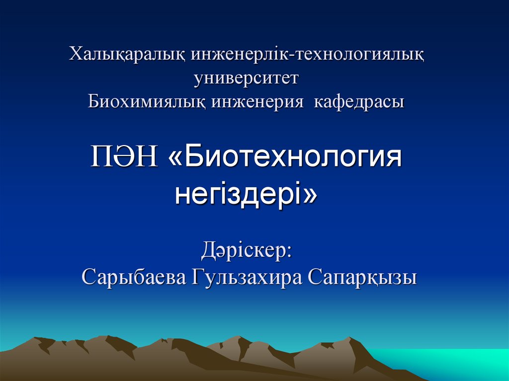 1. Халықаралық инженерлік-технологиялық университет Биохимиялық инженерия кафедрасы ПӘН «Биотехнология негіздері» Дәріскер: