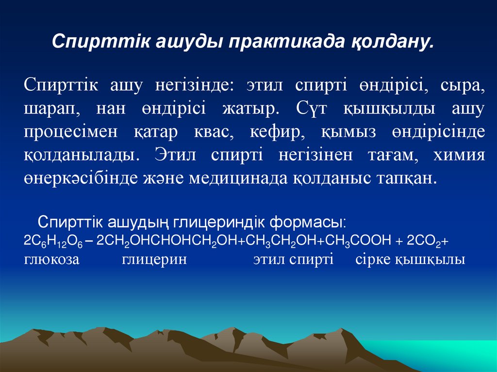 C6H1206=2C2H5OH +2C02+27ккал. Бүл кезде этил спирті мен
