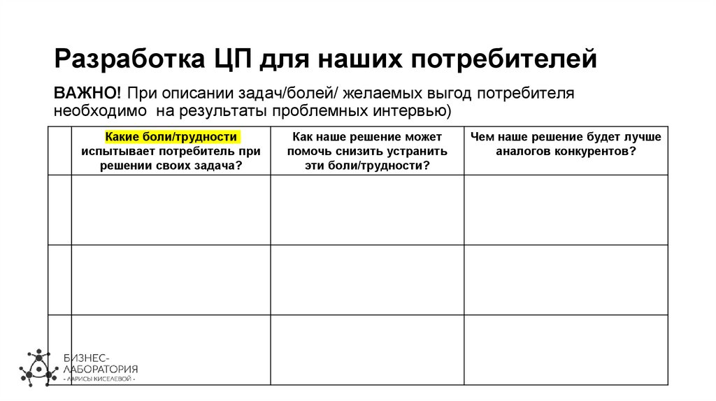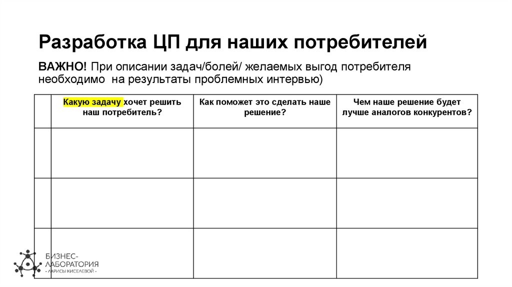 Разработка ЦП для наших потребителейВАЖНО! При описании задач/болей/ желаемых выгод потребителя