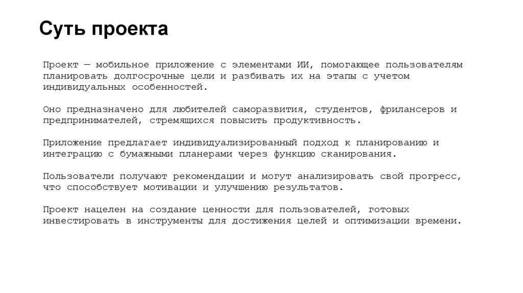 Суть проектаПроект — мобильное приложение с элементами ИИ, помогающее пользователям