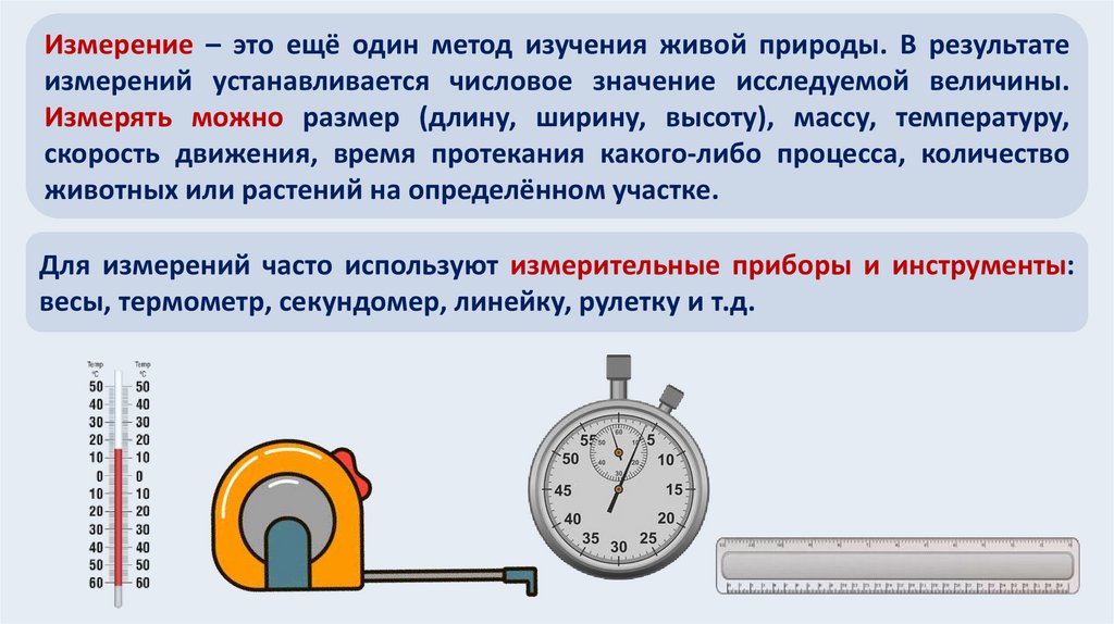 Измерение – это ещё один метод изучения живой природы. В результатеизмерений устанавливается числовое значение исследуемой величины.