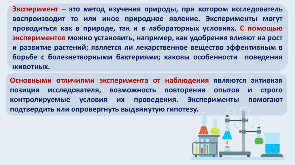 Эксперимент – это метод изучения природы, при котором исследовательвоспроизводит то или иное природное явление. Эксперименты могут
