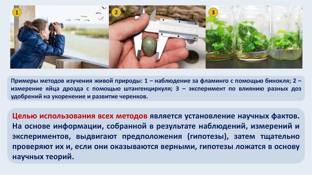 Примеры методов изучения живой природы: 1 – наблюдение за фламинго с помощью бинокля; 2 –