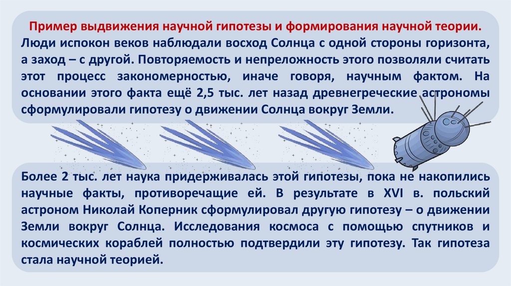 Пример выдвижения научной гипотезы и формирования научной теории.Люди испокон веков наблюдали восход Солнца с одной стороны горизонта,