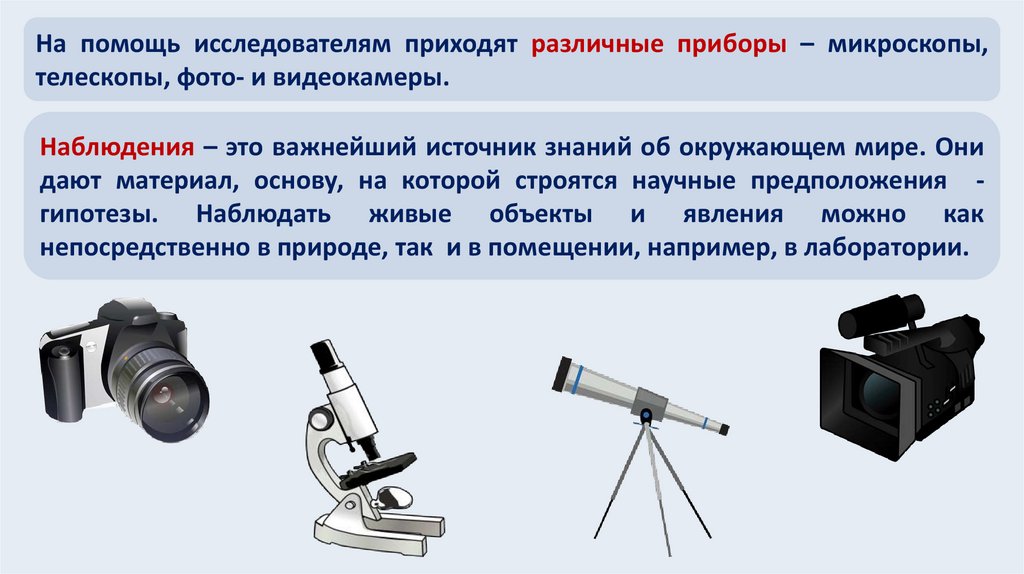 На помощь исследователям приходят различные приборы – микроскопы,телескопы, фото- и видеокамеры.