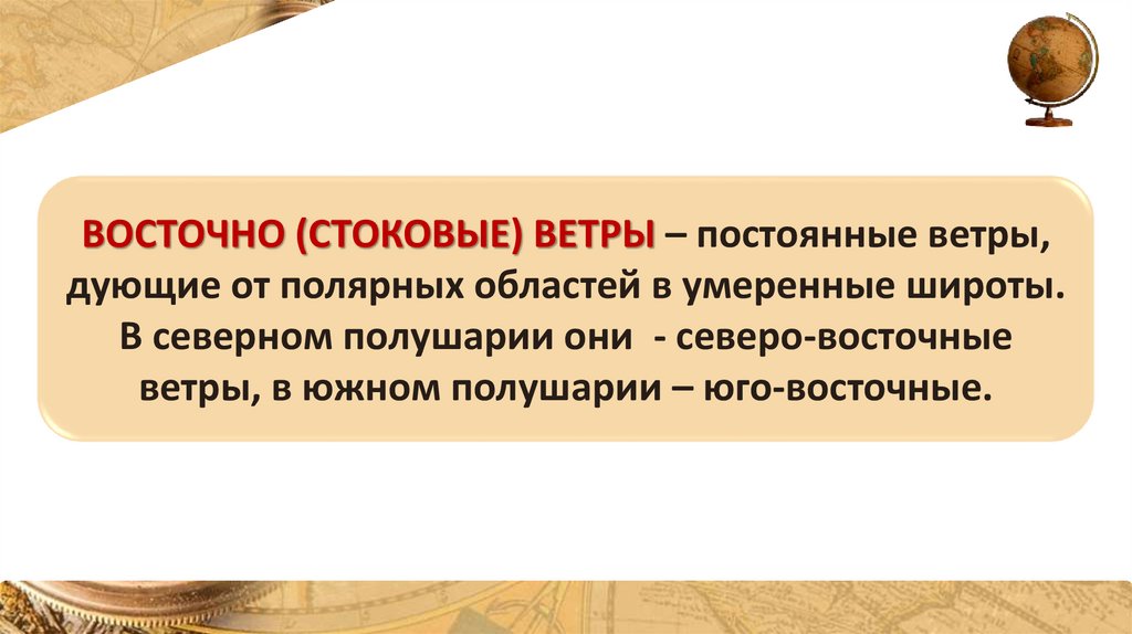ВОСТОЧНО (СТОКОВЫЕ) ВЕТРЫ – постоянные ветры,дующие от полярных областей в умеренные широты.