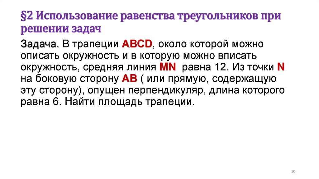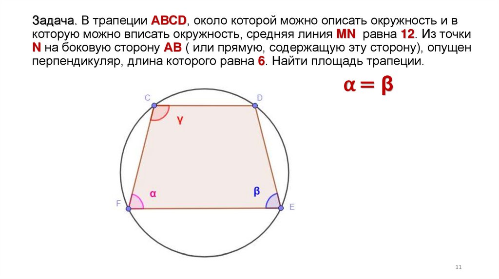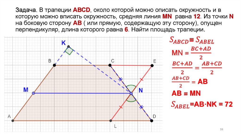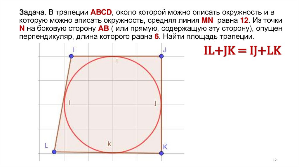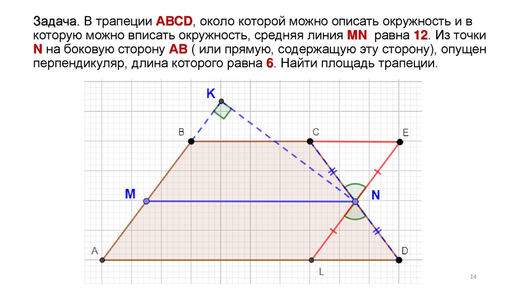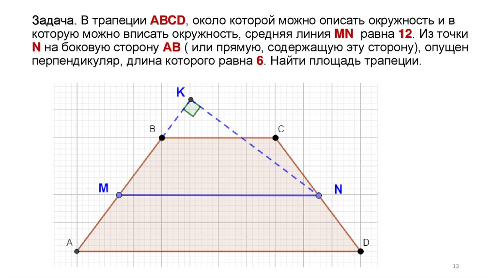 Задача. В трапеции АВСD, около которой можно описать окружность и вкоторую можно вписать окружность, средняя линия MN равна 12. Из точки N