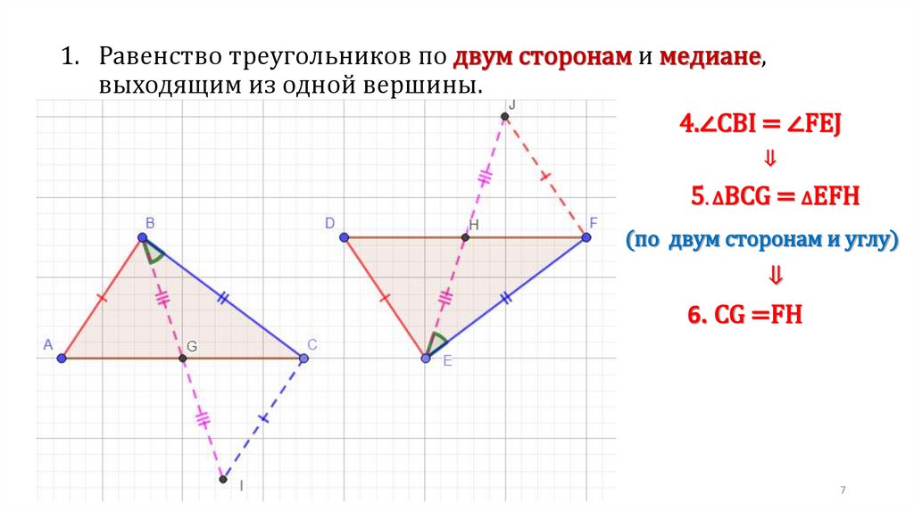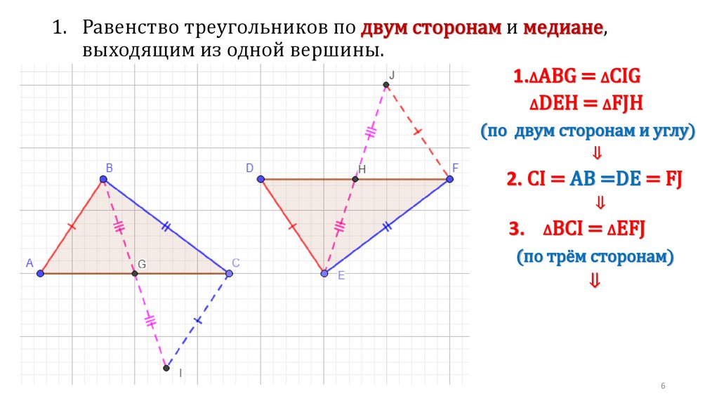 1. Равенство треугольников по двум сторонам и медиане,выходящим из одной вершины.