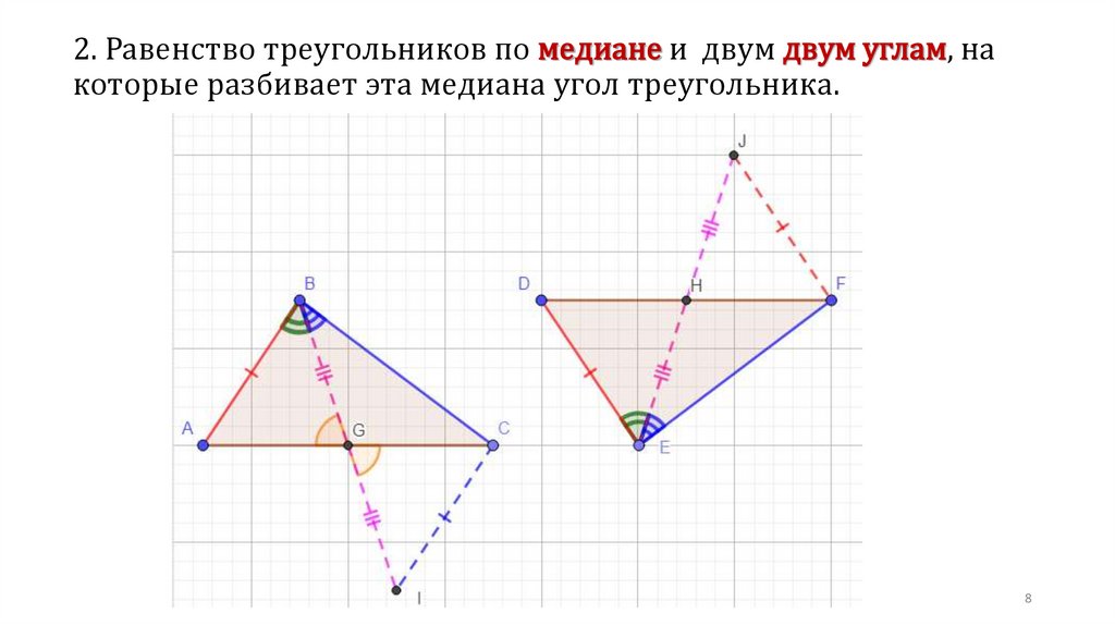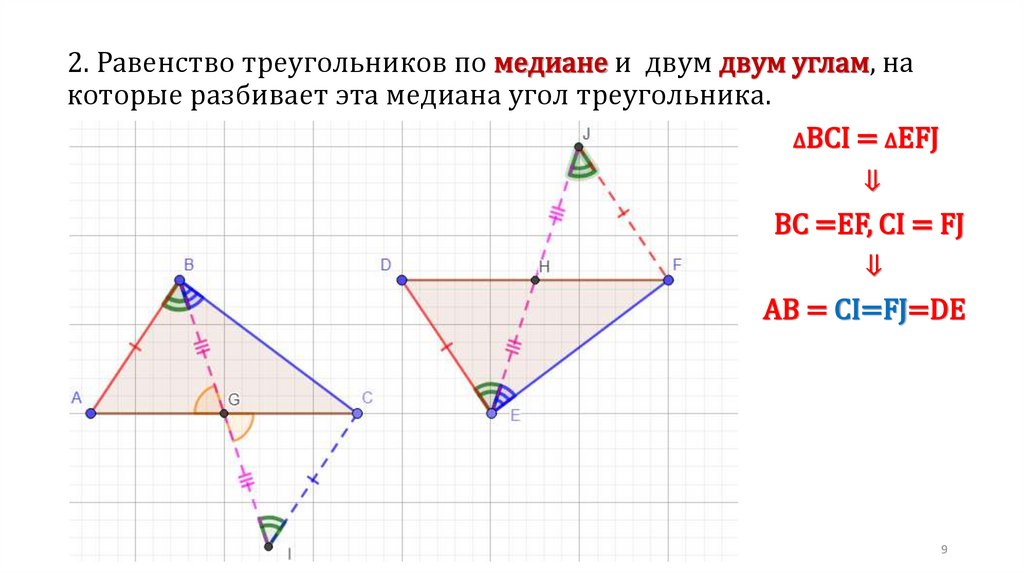 2. Равенство треугольников по медиане и двум двум углам, накоторые разбивает эта медиана угол треугольника.