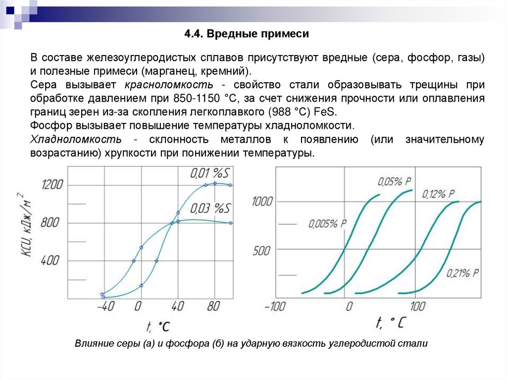 4.4. Вредные примесиВ составе железоуглеродистых сплавов присутствуют вредные (сера, фосфор, газы)