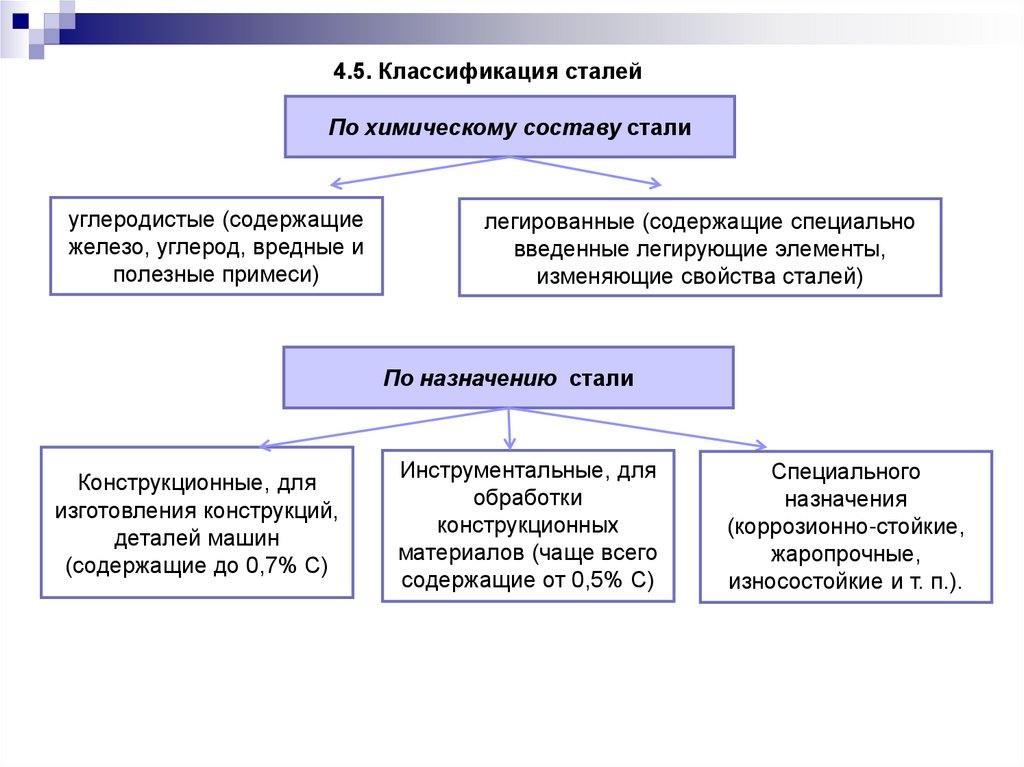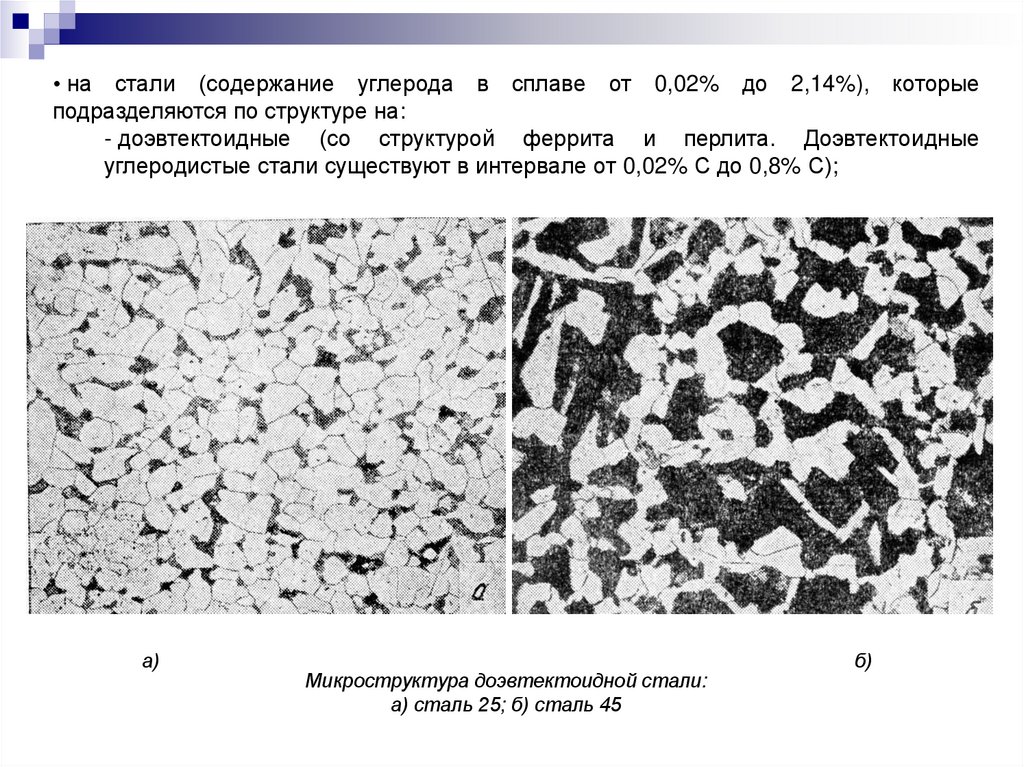 • на стали (содержание углерода в сплаве от 0,02% до 2,14%), которыеподразделяются по структуре на: