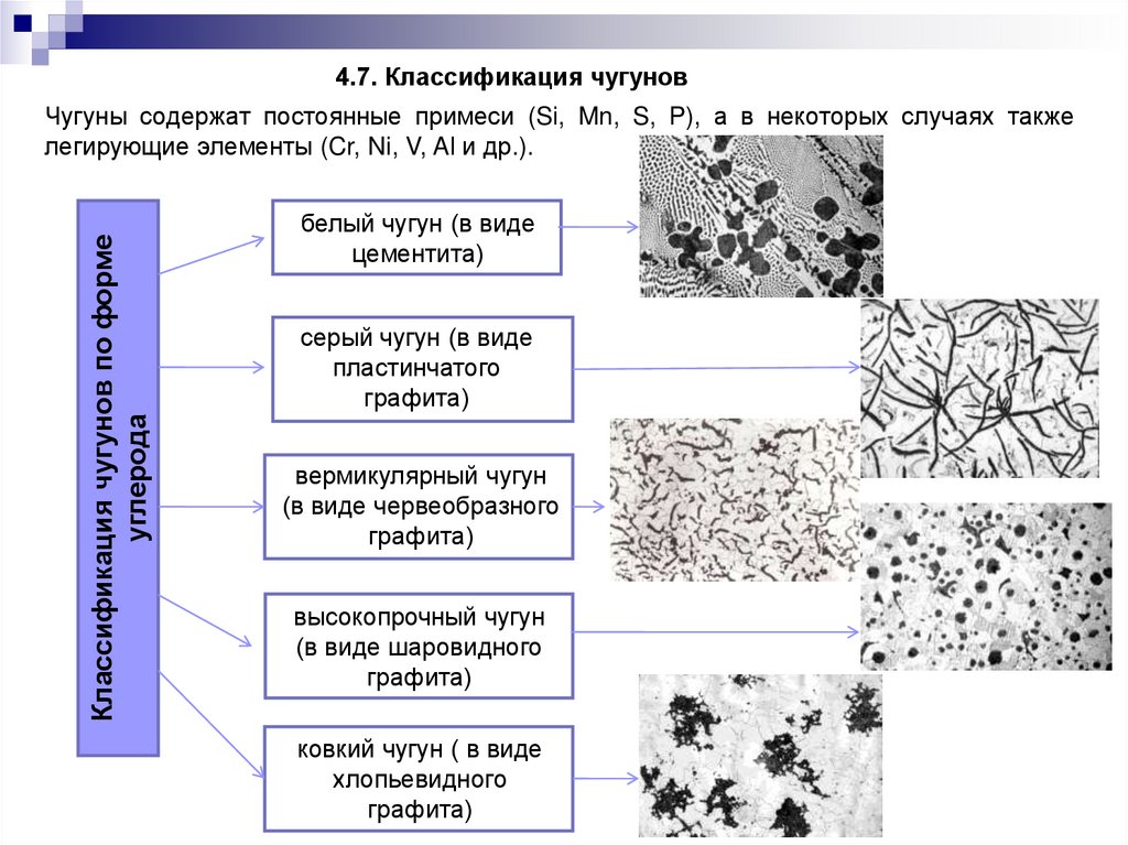 • чугуны (с содержанием углерода в сплаве более 2,14%), которые подразделяютсяпо структуре на: