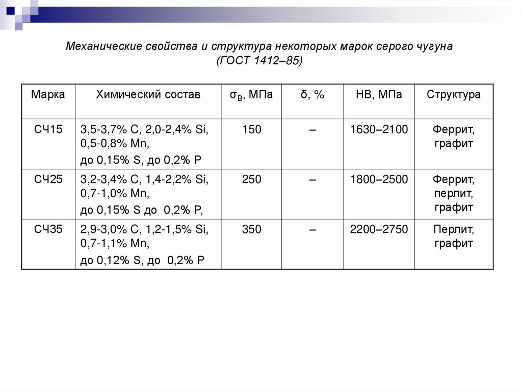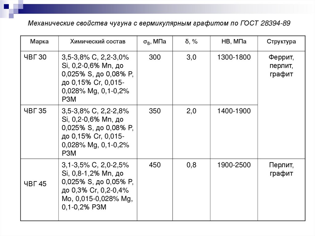 Механические свойства чугуна с вермикулярным графитом по ГОСТ 28394-89Марка