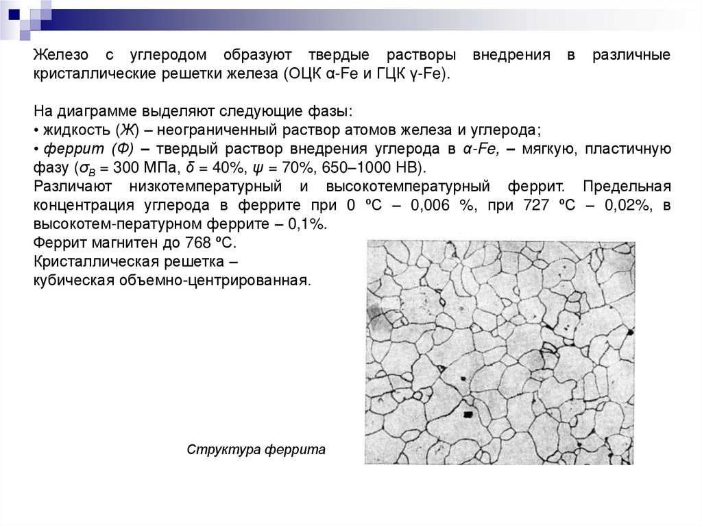 • феррит (Ф) – твердый раствор внедрения углерода в α-Fe, – мягкую, пластичную