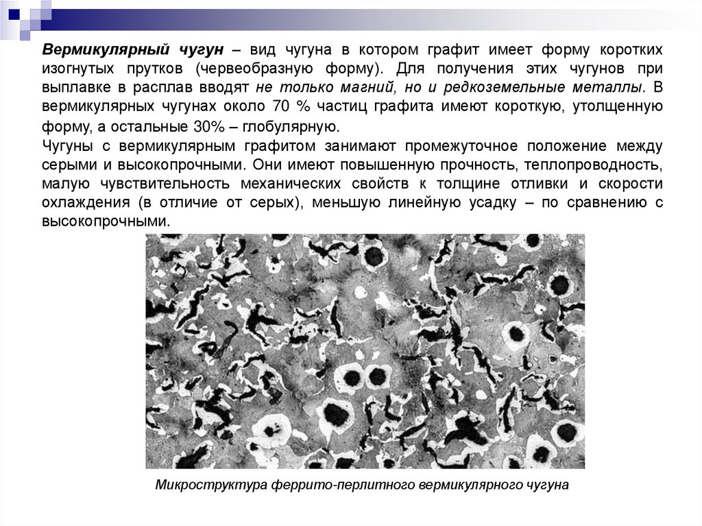 Вермикулярный чугун – вид чугуна в котором графит имеет форму короткихизогнутых прутков (червеобразную форму). Для получения этих чугунов при