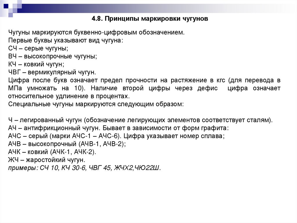 4.8. Принципы маркировки чугуновЧугуны маркируются буквенно-цифровым обозначением.