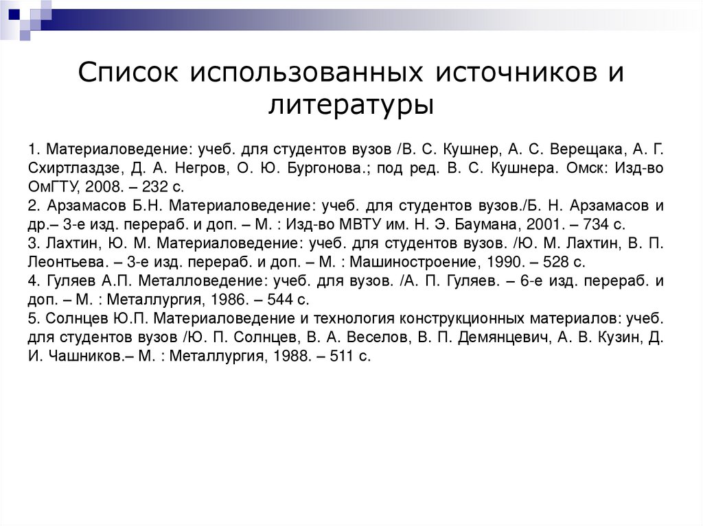 2. Арзамасов Б.Н. Материаловедение: учеб. для студентов вузов./Б. Н. Арзамасов и
