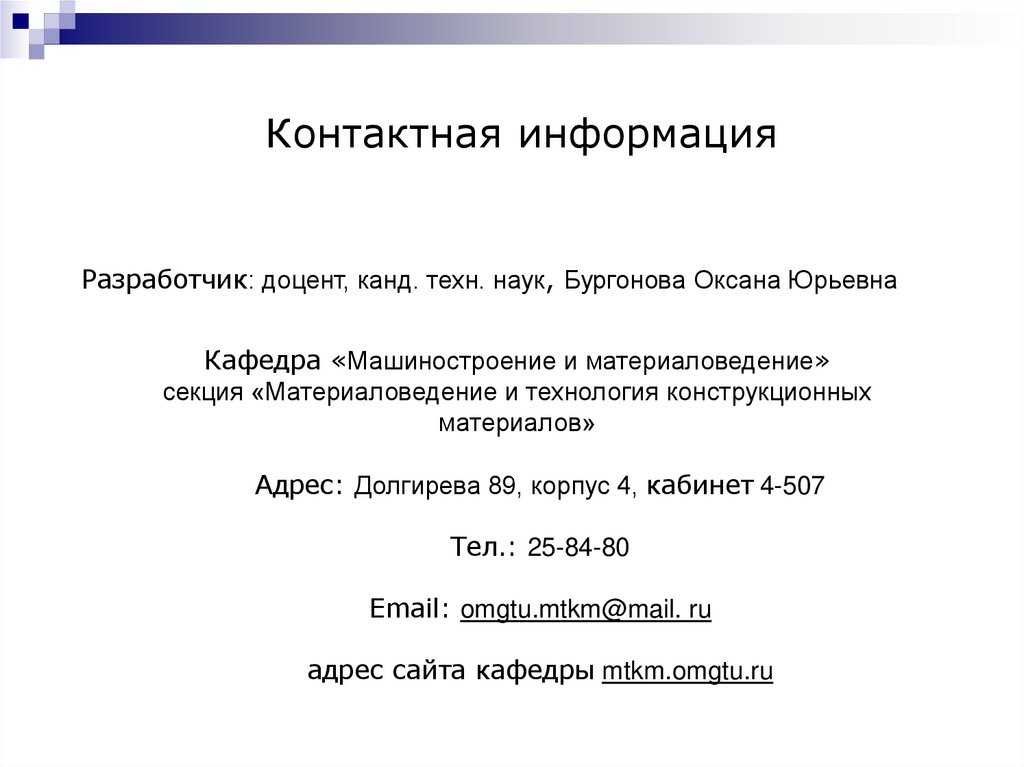 Контактная информацияРазработчик: доцент, канд. техн. наук, Бургонова Оксана Юрьевна