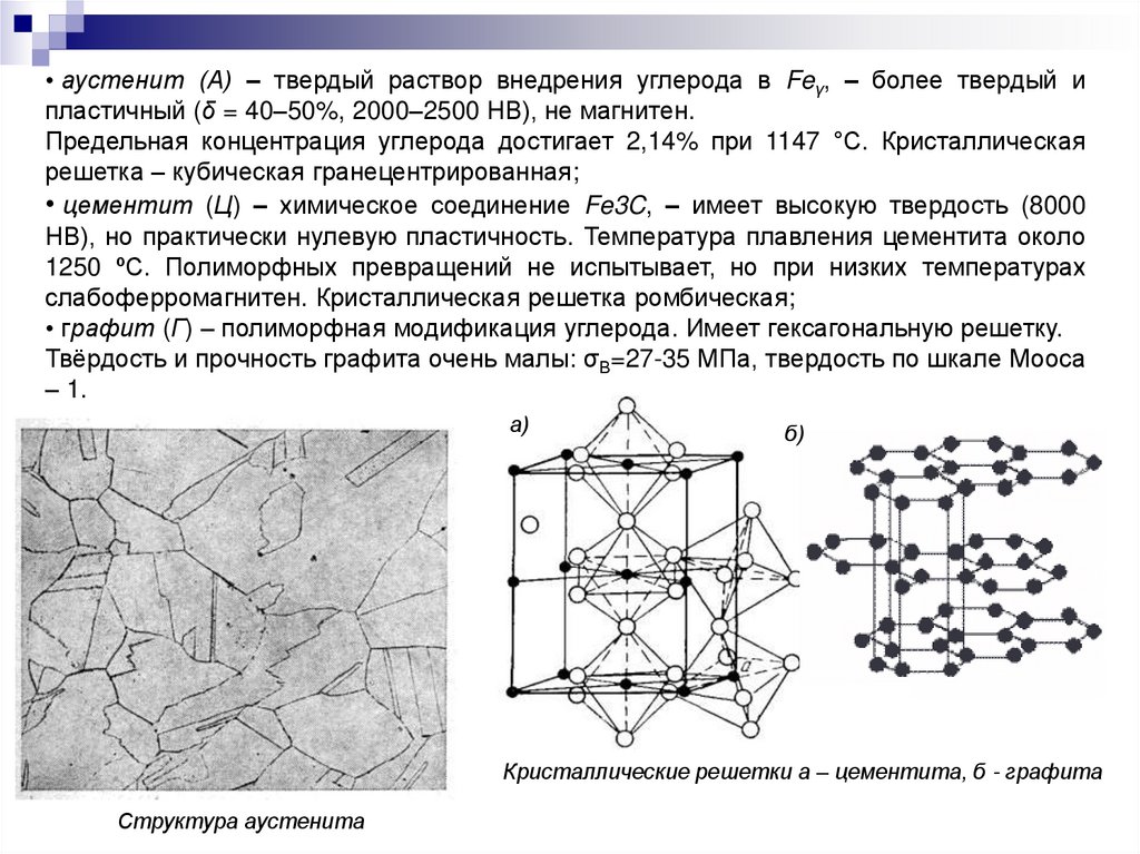 Кристаллические решетки а – цементита, б - графита