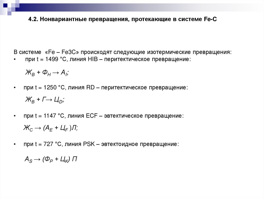 4.2. Нонвариантные превращения, протекающие в системе Fe-CВ системе «Fe – Fe3C» происходят следующие изотермические превращения: