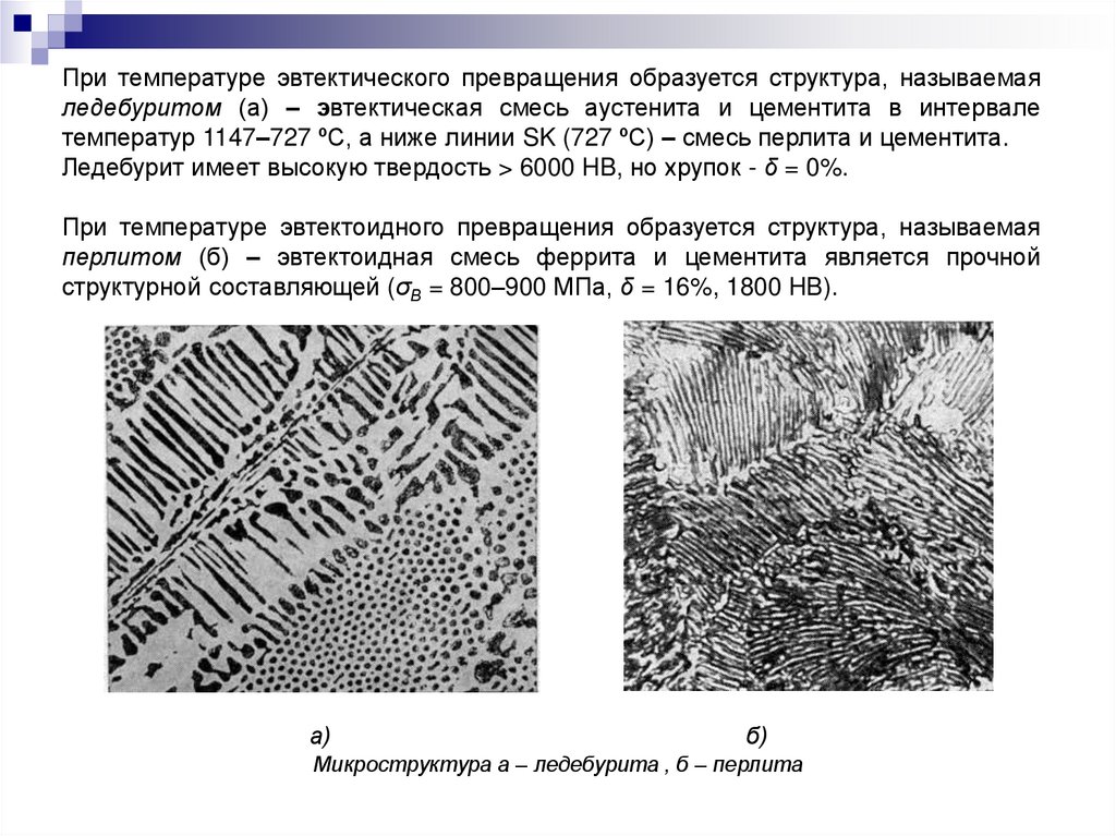 При температуре эвтектического превращения образуется структура, называемаяледебуритом (а) – эвтектическая смесь аустенита и цементита в интервале