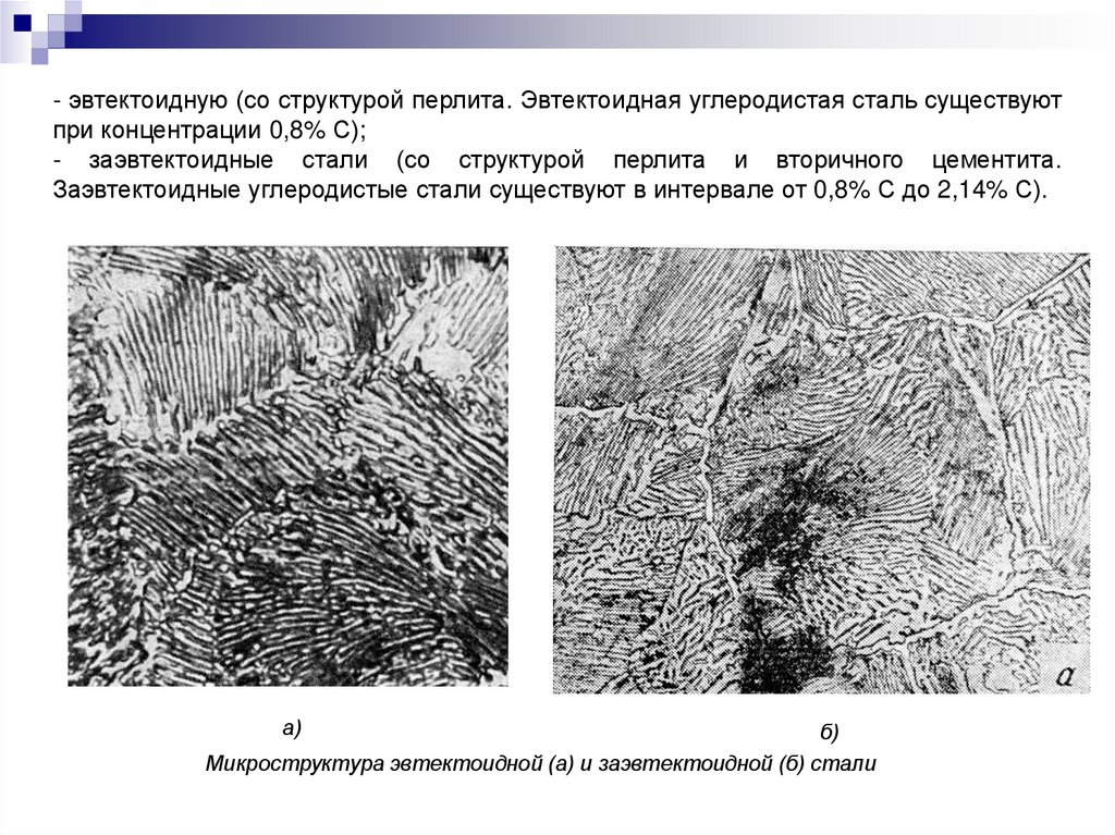 - эвтектоидную (со структурой перлита. Эвтектоидная углеродистая сталь существуютпри концентрации 0,8% С);