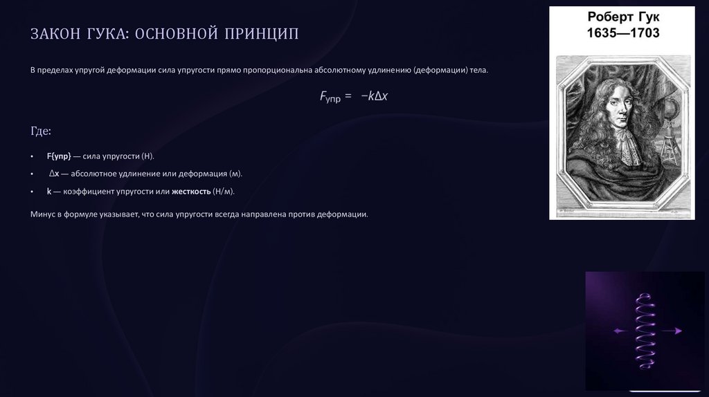 ЗАКОН ГУКА: ОСНОВНОЙ ПРИНЦИПВ пределах упругой деформации сила упругости прямо пропорциональна абсолютному удлинению (деформации) тела.