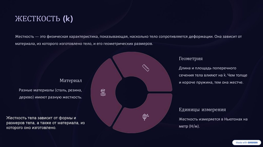 ЖЕСТКОСТЬ (k)Жесткость — это физическая характеристика, показывающая, насколько тело сопротивляется деформации. Она зависит от