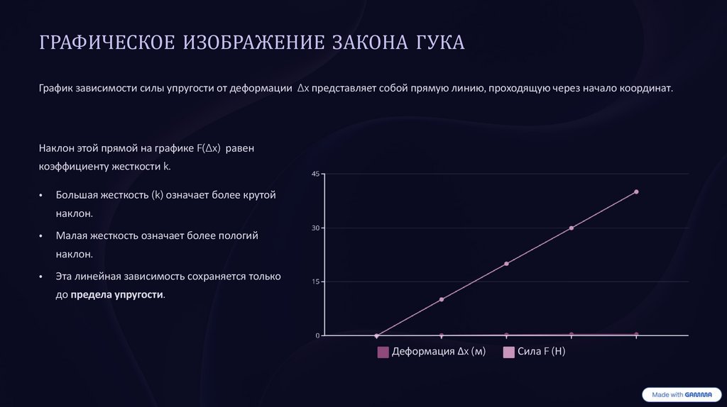 ГРАФИЧЕСКОЕ ИЗОБРАЖЕНИЕ ЗАКОНА ГУКАГрафик зависимости силы упругости от деформации ∆x представляет собой прямую линию, проходящую через начало координат.