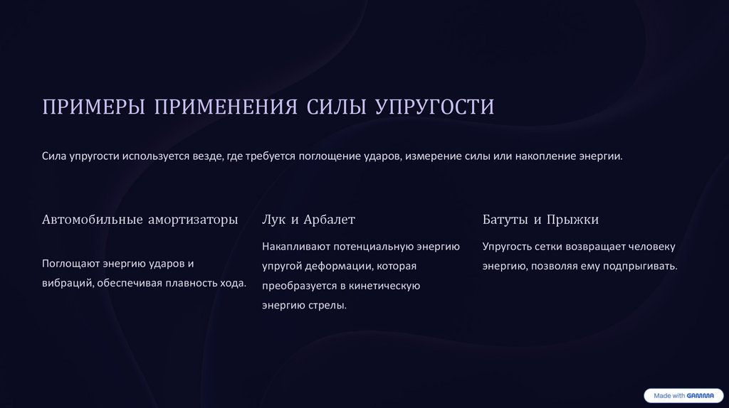 ПРИМЕРЫ ПРИМЕНЕНИЯ СИЛЫ УПРУГОСТИСила упругости используется везде, где требуется поглощение ударов, измерение силы или накопление энергии.