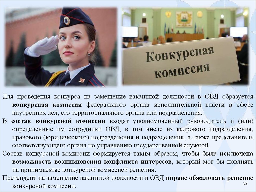 Для проведения конкурса на замещение вакантной должности в ОВД образуетсяконкурсная комиссия федерального органа исполнительной власти в сфере