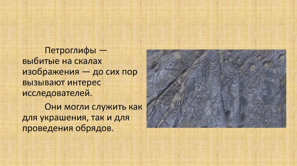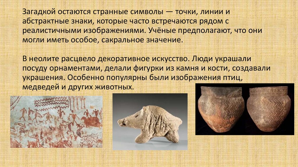 посуду орнаментами, делали фигурки из камня и кости, создавали