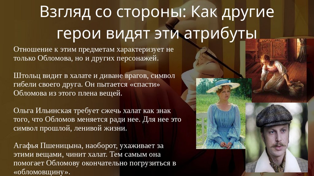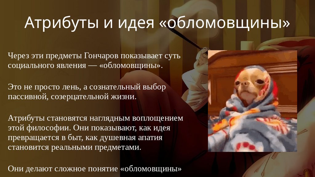 Атрибуты и идея «обломовщины»Через эти предметы Гончаров показывает суть