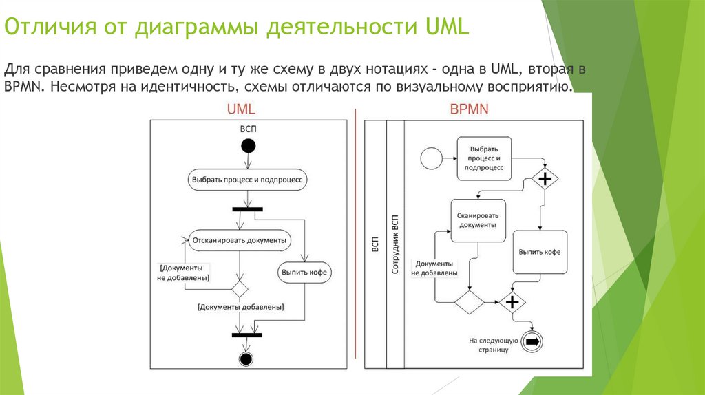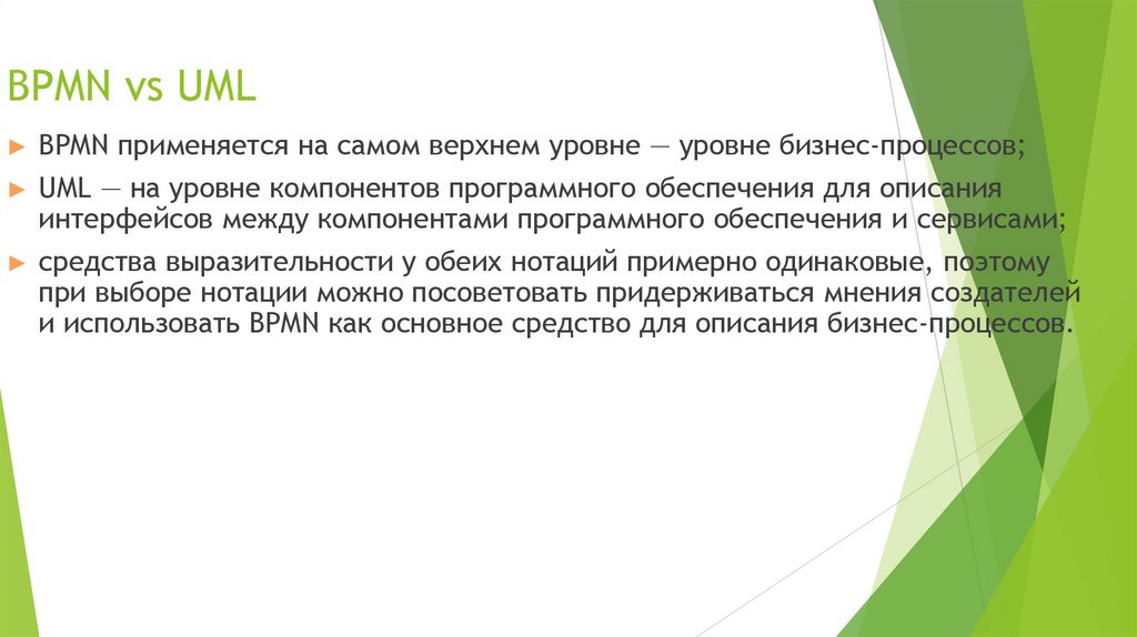 BPMN vs UML► BPMN применяется на самом верхнем уровне — уровне бизнес-процессов;