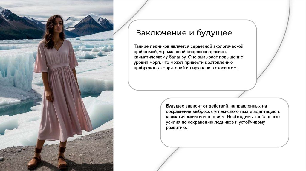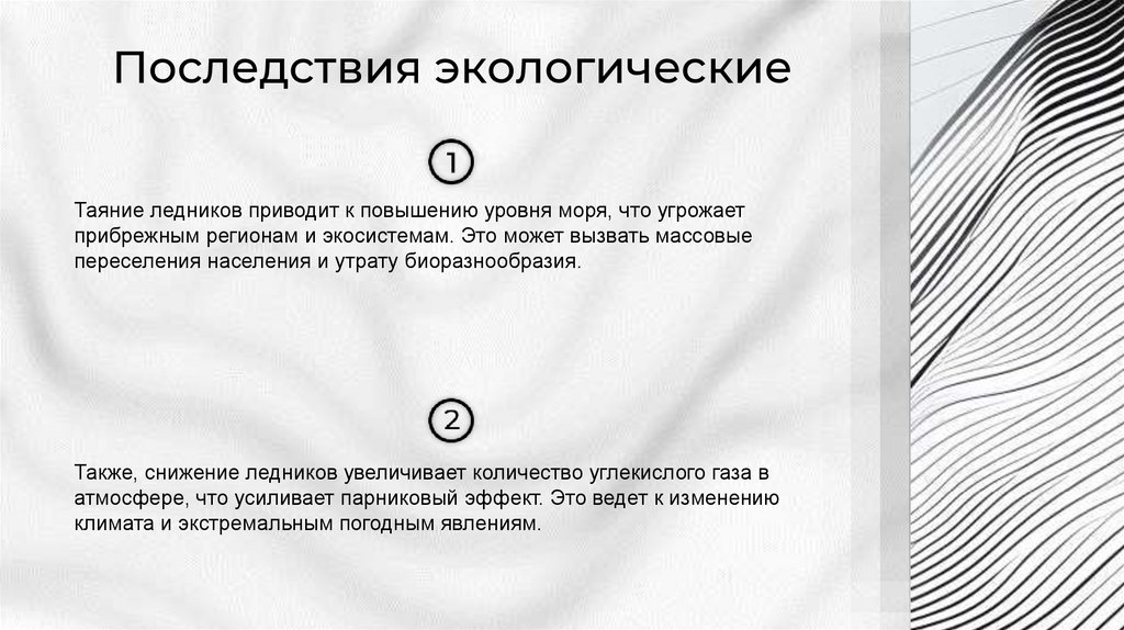 Последствия экологическиеТаяние ледников приводит к повышению уровня моря, что угрожает